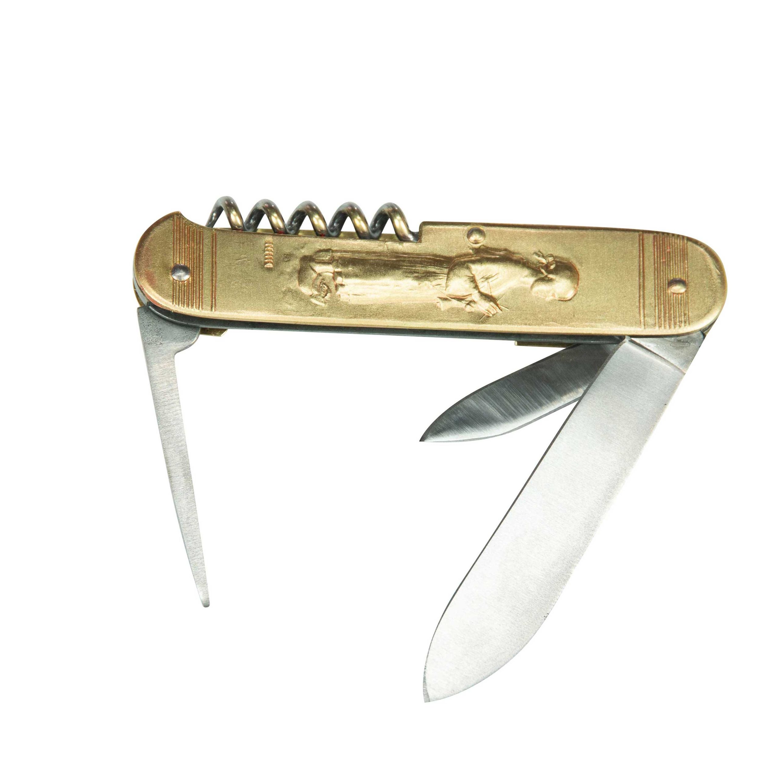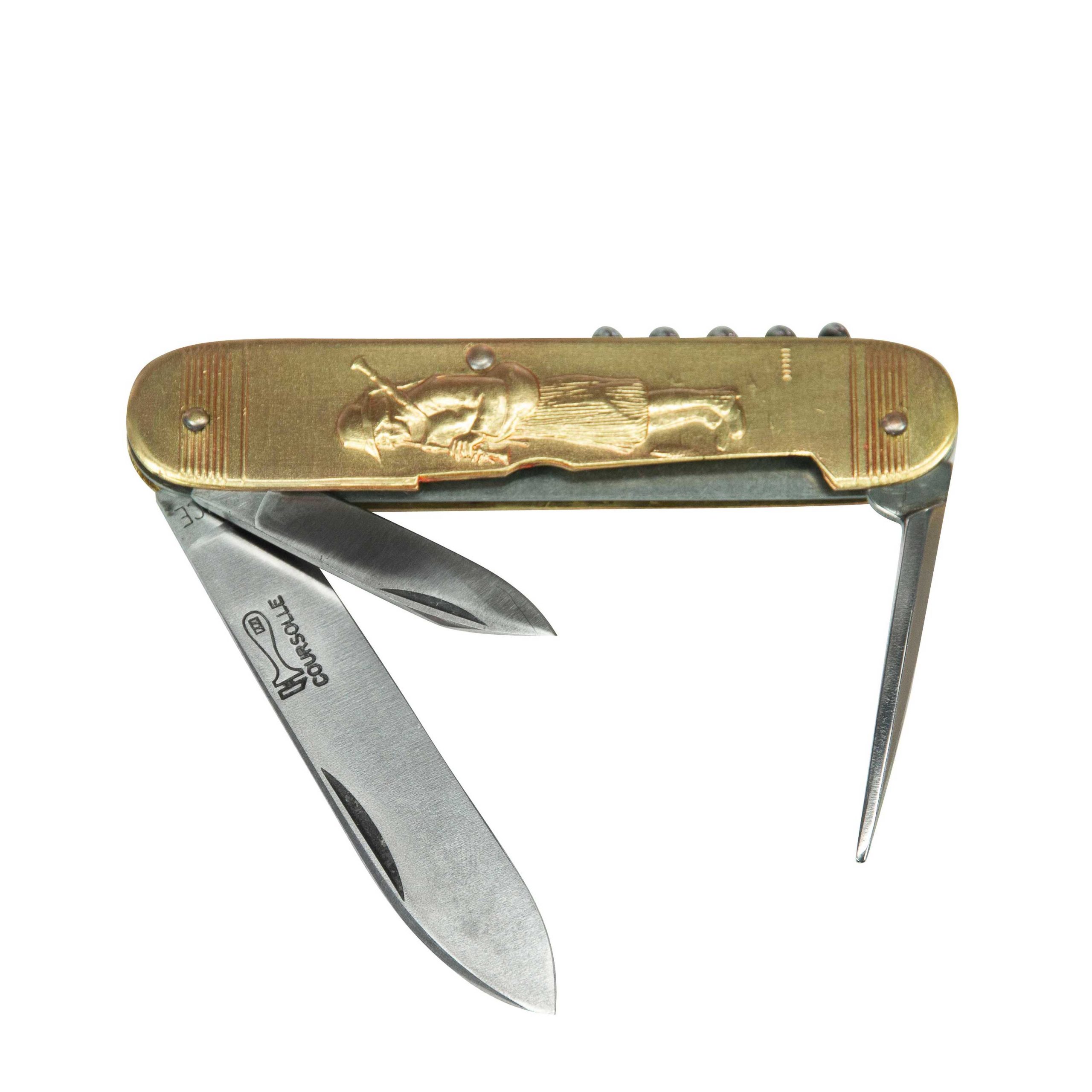 couteau coursolle manche laiton, lame carbone , motif joueur de biniou-tricoteuse