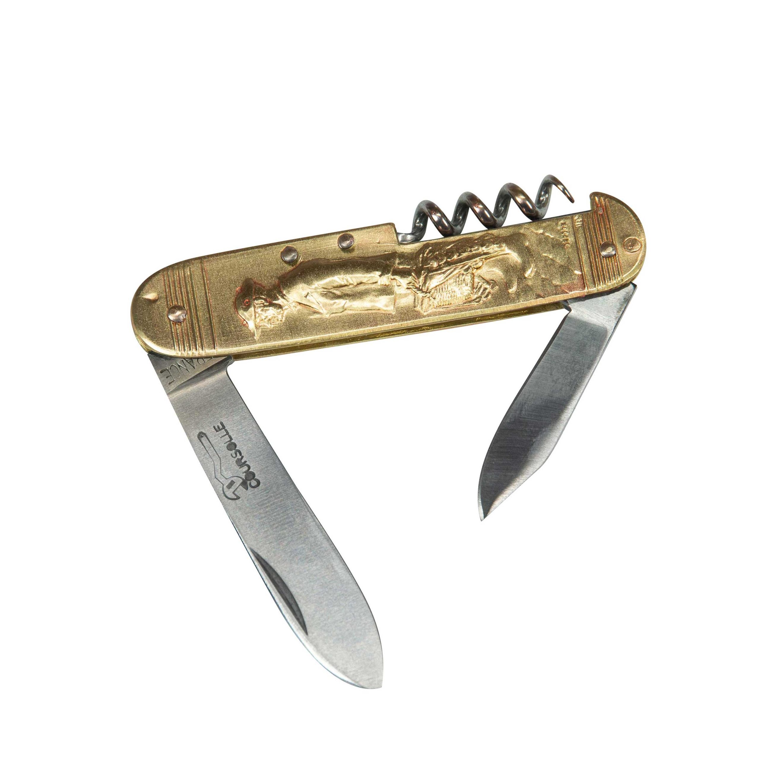 Manches : Décoratifs en laiton. Le décor en relief représente un pêcheur de langoustes sur une face et un port sur l’autre face. A noter que le bateau représenté au fond du décor serait le Titanic. Les 2 parties du manche sont embouties à froid avec en finition un vernis de qualité.