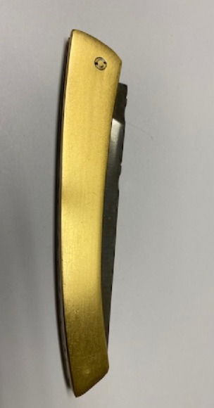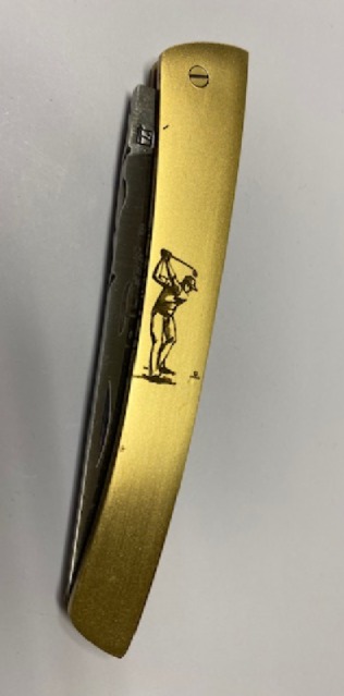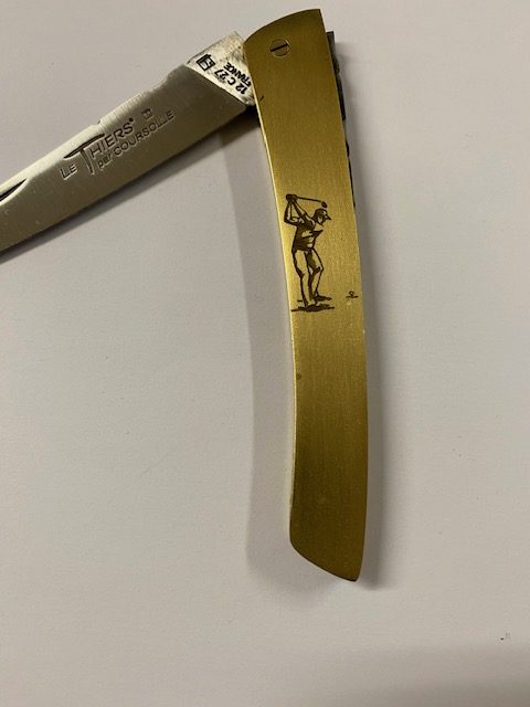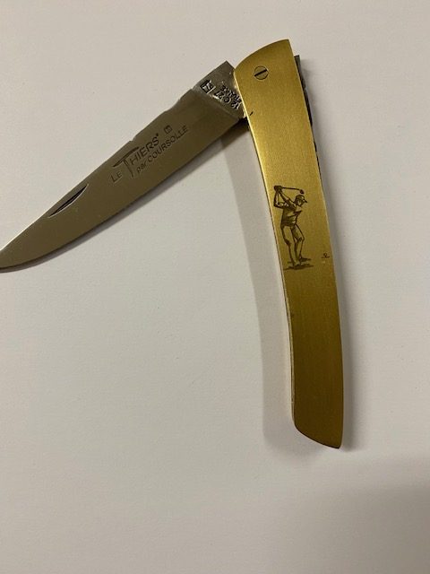 couteau Le Thiers par coursolle manche laiton uni, lame inox, avec un motif de joueur de golf. pour les passionnés de ce sport.