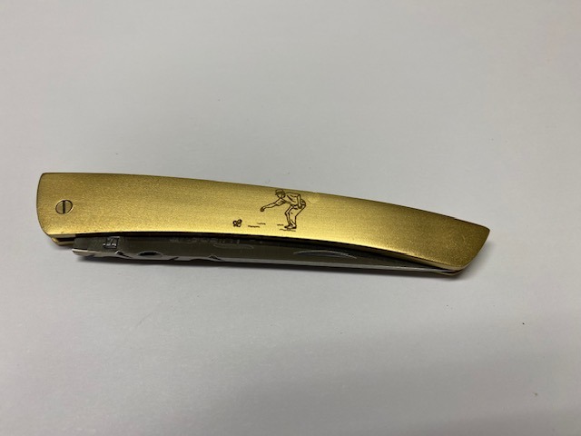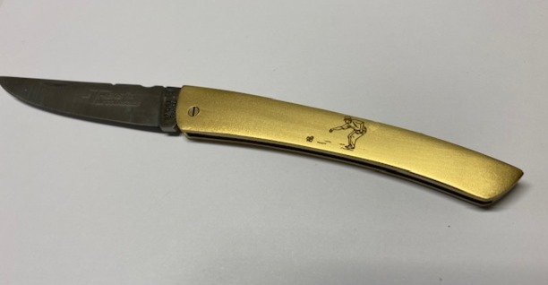 couteau Le Thiers par coursolle manche laiton uni, lame inox, avec un motif de la pétanque. pour les passionnés de cette discipline.