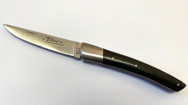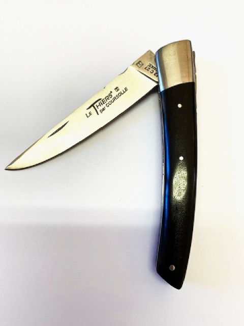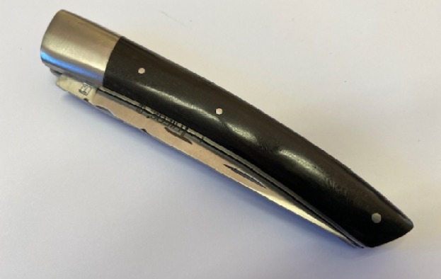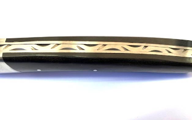 Manches : mitre inox sur le haut du manche, manche en ébène sur platines inox, bois très fonçé. Très joli couteau avec une belle matière.